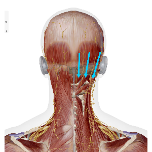 負担になる、頸部、肩上部の筋緊張を取るべく刺鍼。特に後頭下筋群の緊張が強いので、これらが頭痛の原因になっていたと考えられる。